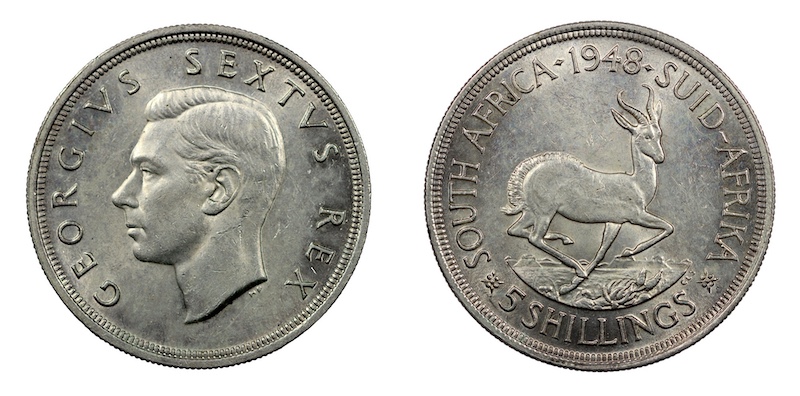 South Africa, 1948 Five Shillings. Sold.