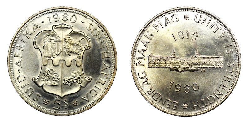 South Africa, 1960 Five Shillings, prooflike. Sold.